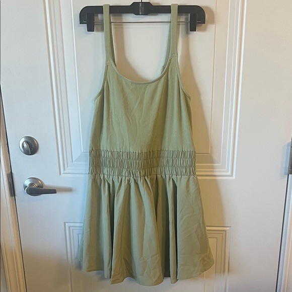 Stylish sage green sleeveless romper with a flared skirt and built-in shorts. Perfect for any upcoming spring outing!