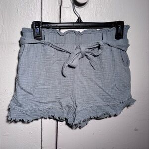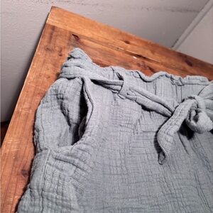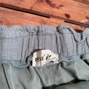 New In Shorts. Moss. Size large. Front tie. Two slip pockets and 1 back pocket. Lined. Elastic band. Polyester/ nylon. Length measures 12 inches. Waist measures 29 inches unstretched. B4