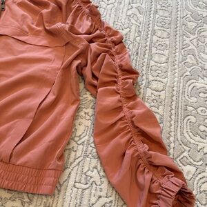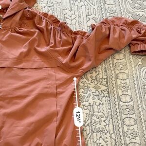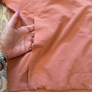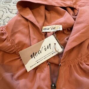 Burnt orange color. Lightweight. Has a hood. Love the scrunched sleeves. Womans size large