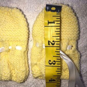 New Infant-12M Hand Knitted Mittens. Satin Bow Ties to Secure to Wrists. Yellow. Smoke Free Home.
