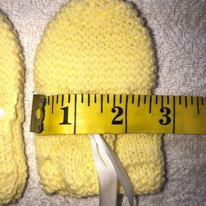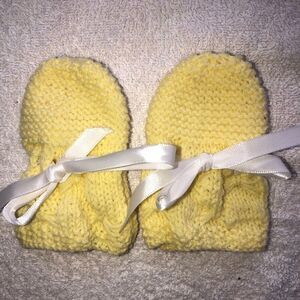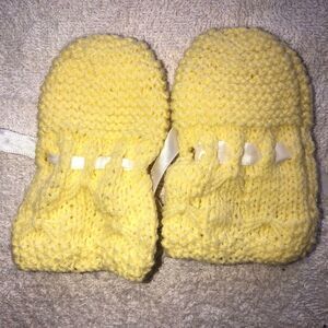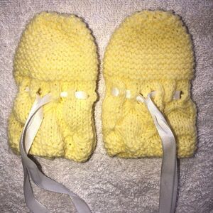 New Infant-12M Hand Knitted Mittens. Satin Bow Ties to Secure to Wrists. Yellow. Smoke Free Home.