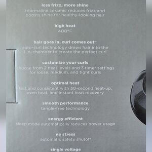 Hair goes in - curl comes out! (with safety sensor for tangle-free curls), Professional brushless motor for precision styling, 2 heat levels and 3 timer settings for loose, medium and tight curls, Tourmaline Ceramic technology eliminates static, reduces frizz and protects hair from heat damage while adding shine, High-performance heater for instant, even heat-up and recovery.