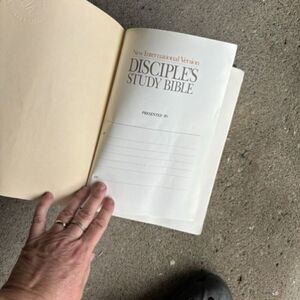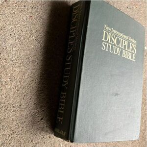 New International Version Disciple’s Study Bible. Cover has some marks and wear. Some of the pages are bent at the corner. Small binding issue between the glossy pages and the Bible pages. I didn’t notice any writing inside.