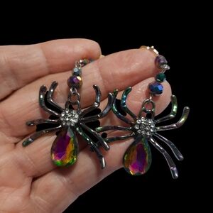 Add a touch of whimsy to your outfit with these stunning iridescent spider earrings. Perfect for making a bold statement.