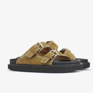 Studded (large grommets) calf suede leather buckle sandals