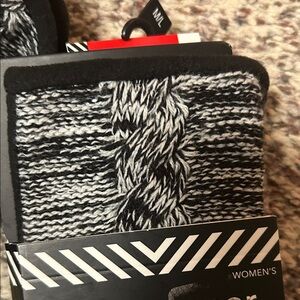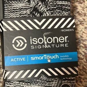 Stylish Isotoner gloves with SmartTouch feature. Black and gray knit pattern. Ideal for winter wear.