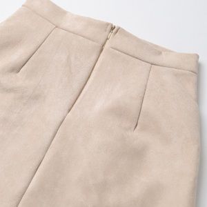 New Autumn Faux Suede Leather Pencil Skirt With High Waist Zip Back. This vintage suede skirt, cut from super soft faux suede, is accented with slender crisscrossing ties and slant pockets. It will give you a stylish and elegant look.