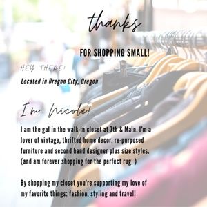 Thank you for supporting my closet. NW 7th and Main is dedicated to environmental responsibility and sustainability. All of our packages are packed and shipped to head straight for reuse and recycle! ♻️ I shop and tend to bring rescued, vintage or orphaned items into my home and closet, reducing the need for product in our landfills. Do the Earth - and us a favor. Buy secondhand, vintage and repurposed items!