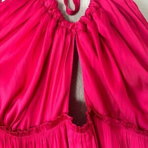 New with tags! Bright hot pink satin midi dress. Halter style with a ruffled waist. Adjustable bust with cute cut out in the middle. Tie neck and back zip closure with ruched detail. Fully lined and excellent quality. Great as an evening cocktail dress, wedding guest attire or other special occasion.