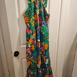 Tiered cotton dress, vibrant tropical print. Midi length. Side zipper. Halter neckline.