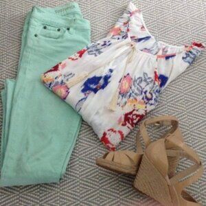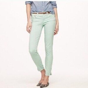 Brand new, never worn, no tags. J.Crew mint-green stretch skinny jeans. Stretch-denim. Mid-rise, skinny, cropped. Belt loops, five pockets, gold ankle zips. Small dot on back near pocket from sitting on shelf. Button and concealed zip fastening at waist. Color is spearmint. Size 25. Box G.