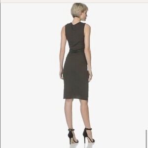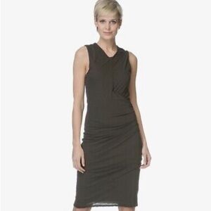 High, rounded V-neck Sleeveless Decorative seam mid-front with a unique draped detail Gathered left side seam for refined pleats