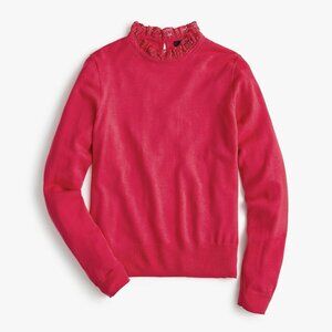 J. Crew Tippi pullover sweater featuring a ruffled lace mock neck detail, back keyhole and button closure, and soft, lightweight 100% merino wool fabrication in a pretty shade of watermelon pink