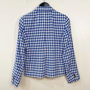 J.Crew Factory suit jacket featuring a notched collar, single-breasted button closure, light shoulder pads, functional button cuffs, flap pockets (still sewn in but can be opened), a pinstripe lining, and lightweight linen/cotton blend fabric in a classic cobalt blue and white gingham check print.