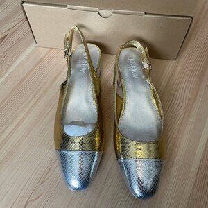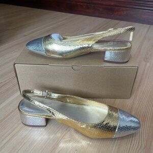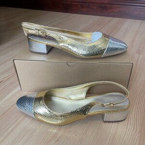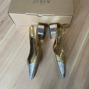 New in box. J.Crew Factory low-heel slingback sandals. Size 7.5. Color is Gold Silver metallic with snakeskin textured leather. Featuring a low heel, cap toe, sling-back adjustable ankle strap. Comfortable, stylish, and sure to dazzle all year long.