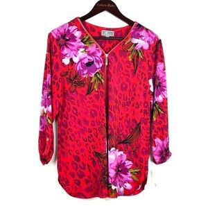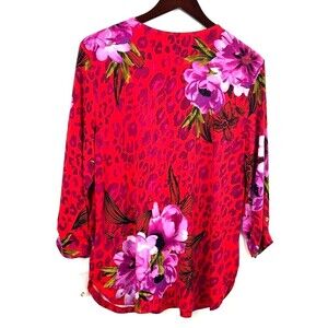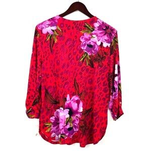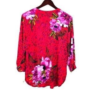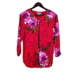 New JM Collection Women Sz PXL Red Pink Zip Neck Blouse Roll Tab Sleeve Tunic U4