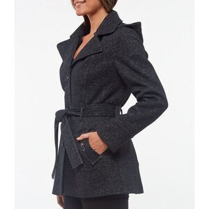 New! JONES NEW YORK Women's Belted Sweater Fleece Coat Hood Black Tweed Small