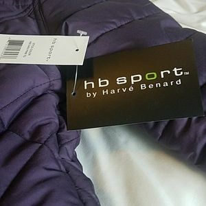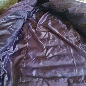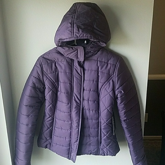Purple puffer jacket with hood. Zipper and velcro. Never worn with tags. Lined with 2 front pockets. It is a medium but fits snug.