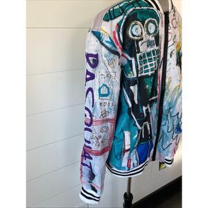This Members Only Jean Michel Basquait full zip jacket is a limited edition piece that features a colorful geometric pattern and the iconic artist's signature logo.