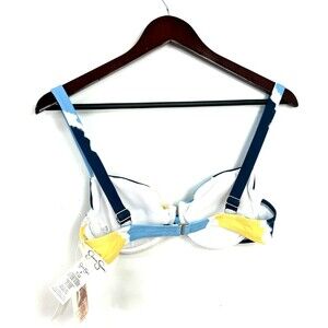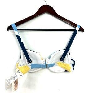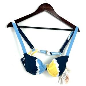 The product is a new Jessica Simpson women's size small smooth sailing tie-dye underwire bikini top. It features a wide strap, one piece design, and a classic beachy theme. The bikini top is made of polyester and spandex, with removable pads and a built-in bra for comfort and support. This stylish and comfortable swim top is perfect for beach outings, vacations, or any coastal activities.