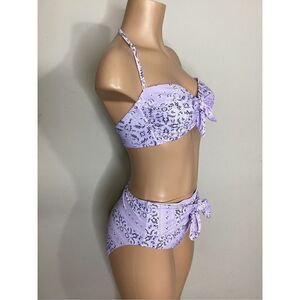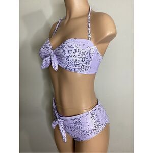 New. Jessica Simpson lavender bandanna bikini set. Bandeau bikini style top with removable straps. Boning on the sides. Soft removable pads. Clasp in the back. The tie can be removed if you prefer by cutting a thread on the inside .