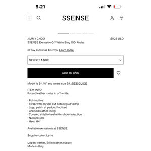 These are Jimmy Choo SSENSE Exclusive Off-White Bing 100 Mules, new with tags and box. They feature a pointed toe and a strap with crystal-cut detailing at the vamp. The upper is made of patent leather in off-white, with a logo patch at the padded footbed and a grained leather lining. The covered stiletto heel has a rubber injection, and the sole is nubuck. The heel height is approximately 4 inches. The shoes still have some of the manufacturer sole tape protection on!
