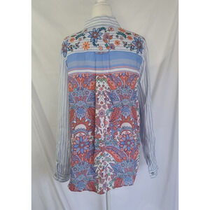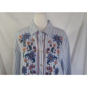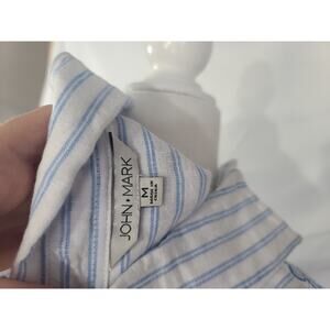 This product is a medium-sized, multicolor striped linen button-down top by John Mark. It features a collared neckline and long sleeves, with a regular fit and woven fabric made of rayon, viscose, and linen. The top is a basic style with a floral pattern and button closure, perfect for a casual or dressy look for women.