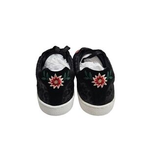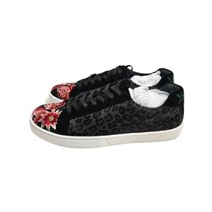 Johnny Was Black Leopard Print Floral Sneakers. Black leopard print calf hair with suede trim and fun contrasting pink floral embroidery at the toe and back heel. Rubber outer soles. Perfectly adds a pop of personality to any outfit.