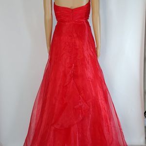 New still with original tag this beautiful Joli A-Line Formal Gown Style 9329 in bright red. The dress is strapless and has a pleated bodice with a silver bow. Measurements- Bust 34, Waist 26, Hip 35.