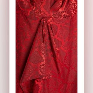 Style yours with drop earrings and towering heels for an evening spent celebrating gown snake-print satin-jacquard ruffled concealed hook and zip fastening at back fully lined mid-weight, non-stretchy fabric dry clean imported. 68% Acetate 32% Viscose. Color: red