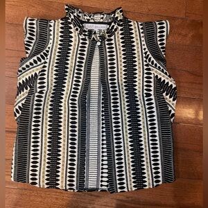 This woven top in a vertical Aztec print is so whimsical and charming. Stand up ruffle collar with a single button closure at the neckline. Short ruffle sleeve is full yet provides full coverage of the underarm. Falls at the natural waist. Material is a sturdy woven pattern with lots of detail a shimmer!