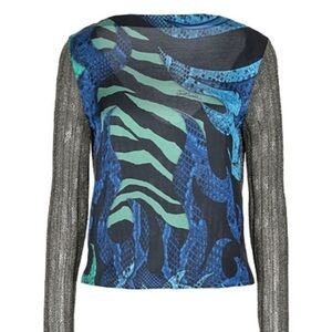 Just Cavalli Italian designer women t-shirt, cover-up top relaxed fit, features wide scooped neckline and draped sleeves decorated with clear crystal logo at the front.