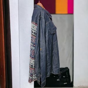 New Justify Women's 2X Denim Shirt Blue Long Slv Button Up Aztec Print Blouse