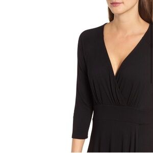 Elegant and alluring, this evening-ready dress is cut from fluid jersey-knit fabric and detailed with graceful draping. 3/4 sleeve Length: 37 1/8 inches (size M) 92% Rayon 8% Spandex Made in Los Angeles, USA Dry clean or hand wash cold Unlined Surplice V neckline Faux wrap New without tags.