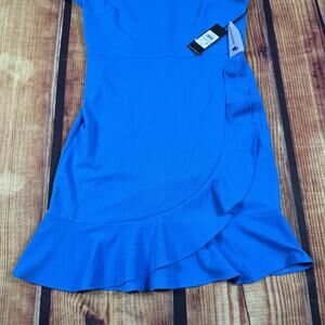 New Karl Lagerfeld Flared Ruffle Dress Womens 6 Blue Above knee flounce Short Sleeve Back Zip Paris $128 Retail