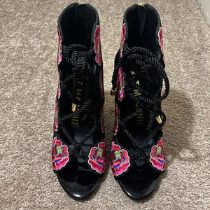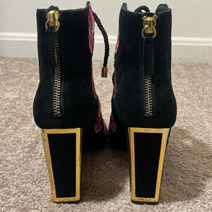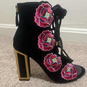Description: brand new, unworn STUNNING Kat Maconie open-toe heels. They feature a soft black suede leather with floral design, as well as a metallic heel block. Design includes a front lace up and back zippers.