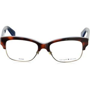 Description: Havana on Blue Frames that features Kate Spade logo on the sides of the temples. These frames come with Clear Demo Lenses.