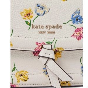 Beautiful KSNY Knott Flip Crossbody in Tulip Toss Pebbled Leather. 5”x7.75”x2” crossbody with magnetic snap closure, 6 card slots, interior slip pocket, exterior slip pocket, interior zip pocket