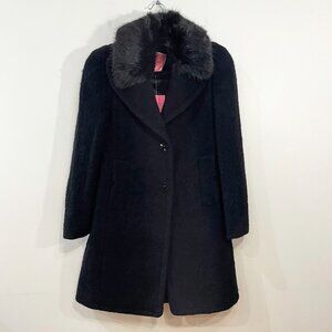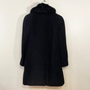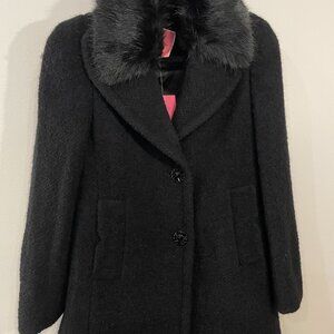 Kate Spade overcoat featuring a shawl collar with detachable faux fur trim, decorative buttons, welt pockets, a fully-lined interior, back vent (still sewn together), and a textured bouclé synthetic/wool blend fabric in classic black. Medium weight, good for fall, early spring, and more mild winter days.