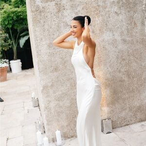 *Purchased this 2 years before my wedding events and our entire wedding plan has since changed and this gown no longer fits our aesthetic. It has never been worn, it has been sitting in the box. Please see size guide in photos (sizing is in AU). **Keep in mind the back of this gown sits very low as it is designed that way (see photos of the back), depending on your shape you may still need alterations. It does fit big on me and the back needed to be taken up to cover my butt. I should’ve sized down but the designer said the alterations could be made.