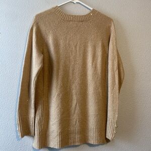 Easy fit, v-neck sweater with a stepped hem, side slits, and rhinestone buttons at the cuff.