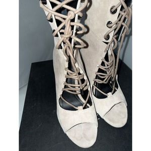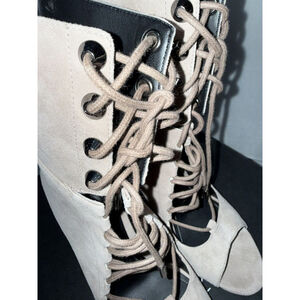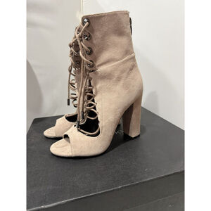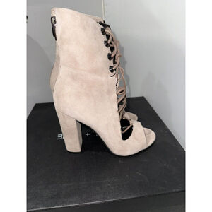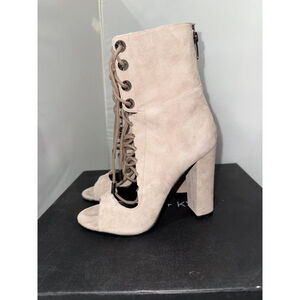 The "Kendall & Kylie Ella Booties" are women's tan cream suede boots with a lace front and zip back closure. This bootie style features an ultra-high heel, making it a fashionable choice for those looking to add some height. The booties are in a US size 6 and come in a stylish gray color. The combination of the lace and suede materials gives these boots a trendy and chic look, perfect for adding a touch of sophistication to any outfit.