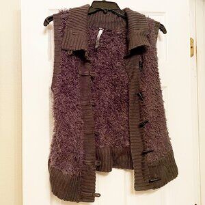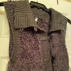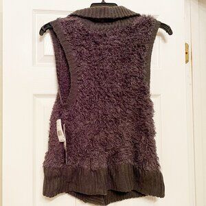 This is a new-with-tags Kensie soft fuzzy sweater vest in dark pewter with a shawl collar and rib-knit trim. Horn-shaped buttons with loop closure. Composition: 100 percent nylon body, 100 percent acrylic trim. Size XL. Smoke-free home.