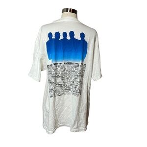 Classic white tee with a soft vintage feel and some wear, including a small discoloration spot on the front (shown in photos). Size tag is faded but fits like a men’s large—please refer to measurements for accuracy. Perfect for NKOTB fans, Y2K collectors, or anyone who loves nostalgic boy band style.