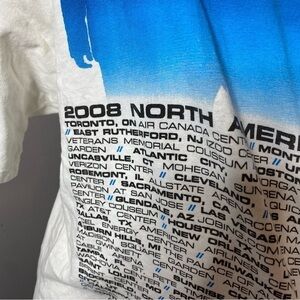 Throwback alert! This official 2008 New Kids on the Block North American Tour t-shirt features a bold front graphic of the band in black suits and sunglasses with a cityscape backdrop, plus a complete list of tour stops on the back.