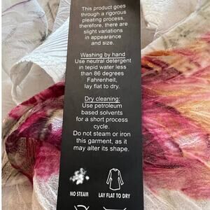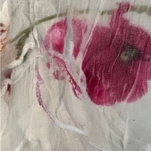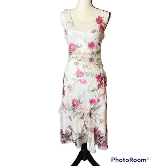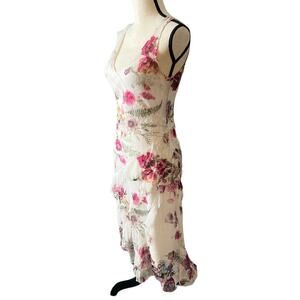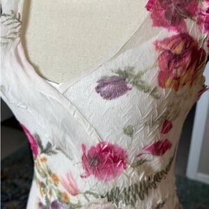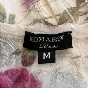 Komarov sleeveless dress in cream with pink, purple, multicolored floral print and delicate layers of material. Beautifully pleated and fully lined. A part of the trim on one layer is coming loose (several inches) - see pic. #10 - can be sewed, but not very noticeable because of the pleating and layers.