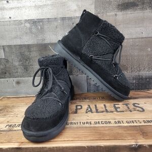An ankle-grazing version of the Michon Short, unique pull-on calls for style kudos along with comfort and winter practicality. With its suede exterior and wrap-around bootlace detail, the Michon Mini is a down-to-earth mood. Dreamy curly faux fur inside and out, makes for warm snug toes in chilly elements.