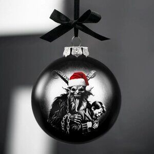 Glass Krampus bulb ornament- Design is on front and back- Black satin bow- Arrives in gift box