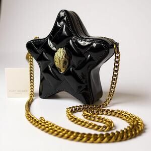 The New with Tag and Dust Cover Kurt Geiger Kensington Star Crossbody with Chain handle Mini Bag is a stylish and versatile accessory for women. Made from quilted patent leather with a star-shaped design, this mini bag features a zip closure and a brass color crossbody strap with the classic gold tone and jeweled 3D bird head logo hardware accent. Perfect for various occasions like parties, casual outings, or formal events, this bag also includes rhinestone accents for added glamour. The Kurt Geiger brand, known for its unique designer pieces, adds a touch of luxury to this trendy and whimsical handbag.