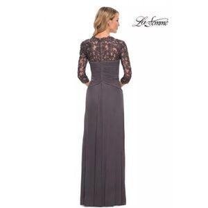 This stunning LA FEMME gown is the perfect addition to your wardrobe. The gunmetal color and lace fabric make it ideal for a wedding or formal occasion. The dress features an empire waist and 3/4 sleeves, with a V-neckline and zip closure for easy wear.